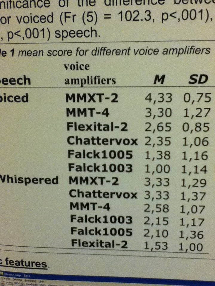 Andreas Lind gjorde akustiska mätningar och lyssnarbedömningar av röstförstärkare i sitt examensarbete i logopedi Umeå universitet. Fotot visar en del av hans poster. Den visar att röstförstärkare från Xena Medical låter riktigt bra om talaren har tonande röst och att Chattervox är en värdig konkurrent vid viskat tal. Vi har exemplar av alla i listan nedan i vårt förråd på jobbet. Ett tillbehör som är intressant är Chattervox svanhals-variant, kolla upp den!